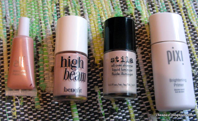 Left to right: e.l.f. Shimmering Facial Whip in Lilac Petal, Benefit High Beam, Stila All Over Shimmer Liquid Luminizer in Pink Shimmer, Pixi Brightening Primer in Pearl Essence
